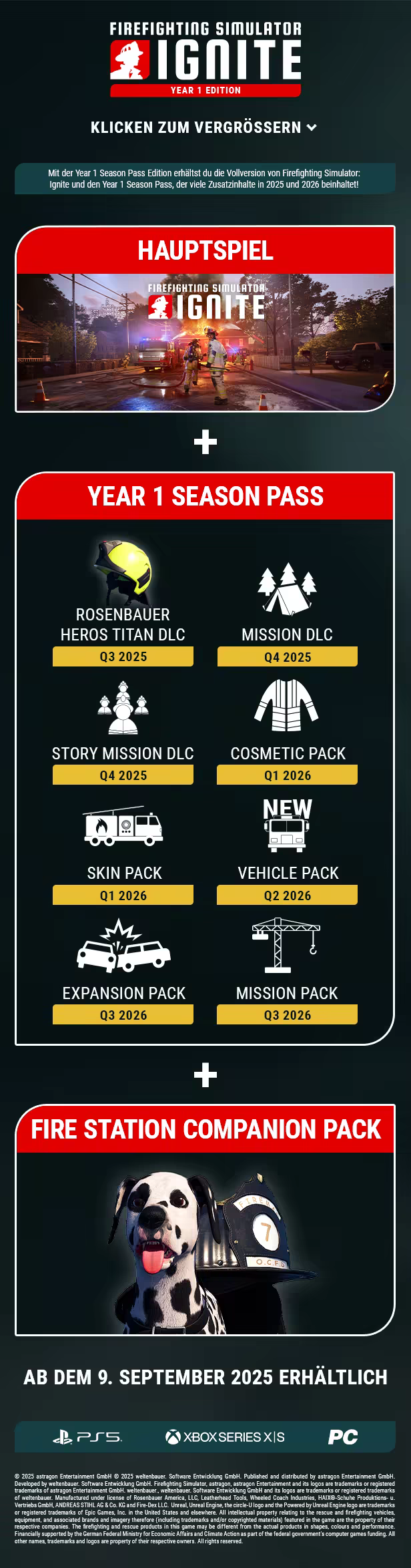 VEREINT GEGEN DIE FLAMMEN. Stelle dich den Gefahren, bekämpfe mit deiner Einheit gefährliche Brände und rette Leben in Firefighting Simulator: Ignite. Schlüpfe in die Rolle eines US-Feuerwehrmannes in einer weitläufigen Stadt im Mittleren Westen der USA, wo dich jeder Einsatz bis an die Grenzen fordern wird. Erlebe den Nervenkitzel der Brandbekämpfung in atemberaubender visueller Qualität in einem intuitiven und kooperativen Multiplayer-Modus mit bis zu 3 Freunden oder mit einer Crew aus NPC-Mitgliedern. Kämpfe gegen tobende Flammen, Hitze und Rauch, die in Echtzeit mit den hochmodernen Physik- und Grafiksystemen der Unreal Engine 5 simuliert werden, und tauche auf eine noch nie dagewesene Weise in die Brandbekämpfung ein.