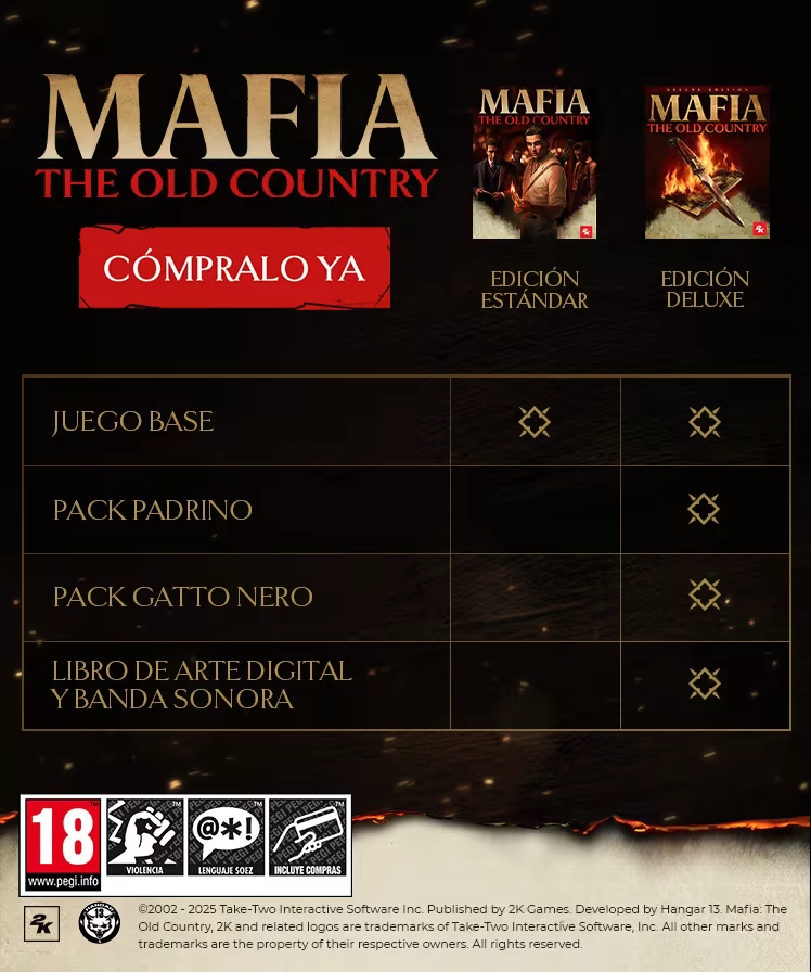 Descubre los orígenes del crimen organizado en Mafia: El Viejo Continente, una cruda historia de mafiosos ambientada en el brutal submundo de la Sicilia de principios del siglo XX. Lucha por sobrevivir en la piel de Enzo Favara y demuestra tu valía a la Familia en esta inmersiva aventura de acción en tercera persona ambientada en una época peligrosa e implacable.