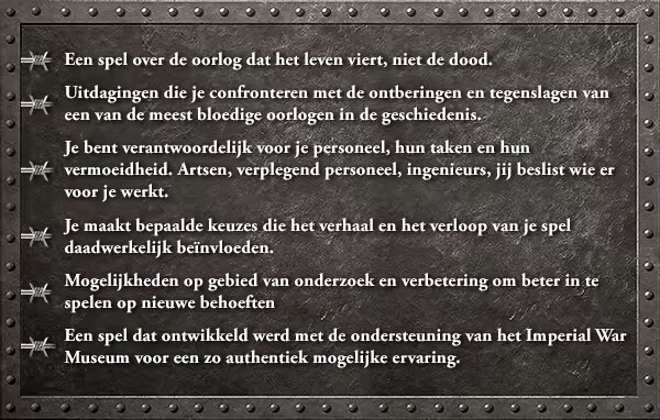 Je staat aan het hoofd van een veldhospitaal tijdens de Eerste Wereldoorlog en neemt de nodige beslissingen om de soldaten te laten overleven en het front te ondersteunen. In deze managementgame ben jij het laatste bolwerk van hoop voor de mensheid.